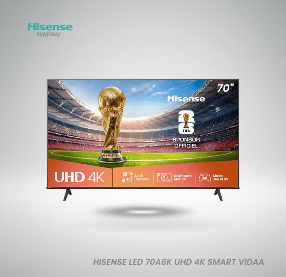 Votre magasin électronique à Dakar, Teranga Tech Store, est le spécialiste de la vente d’électroménager au Sénégal. Nous vous proposons la Hisense 70A6K via notre plateforme d’achat en ligne au Sénégal avec une garantie de qualité. Pour explorer d’autres formats, découvrez notre catalogue de téléviseurs 70 pouces et plus.